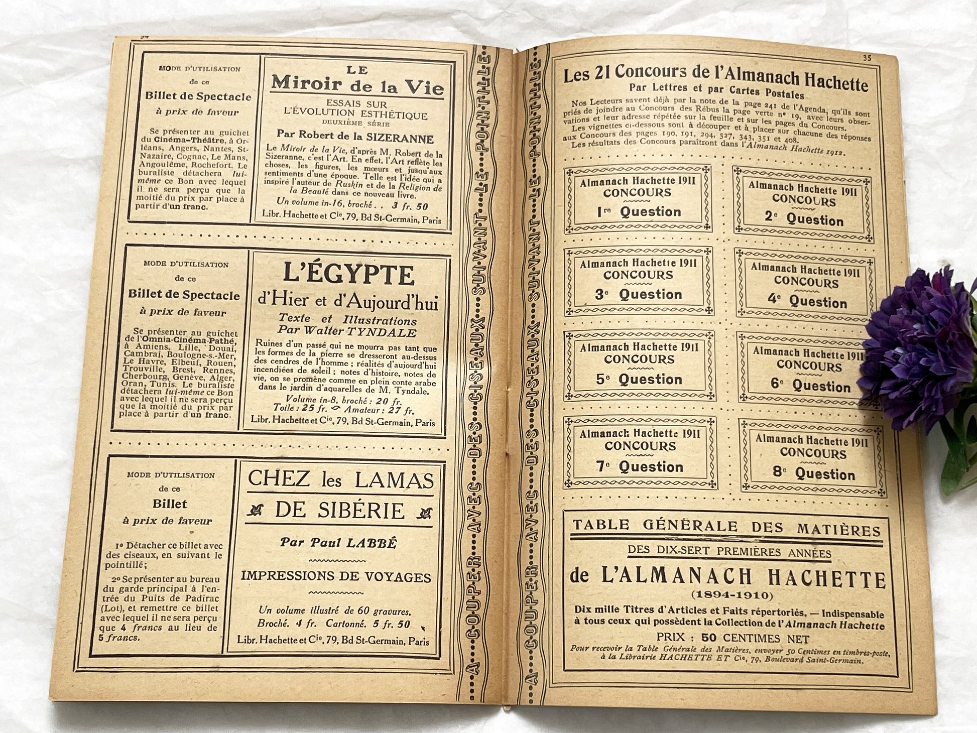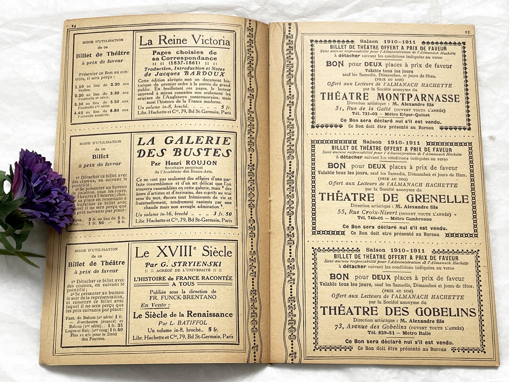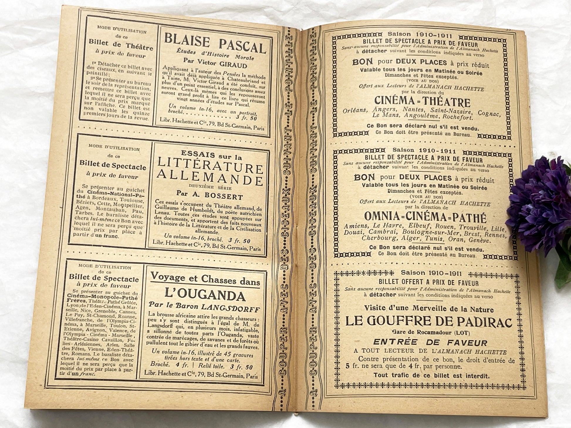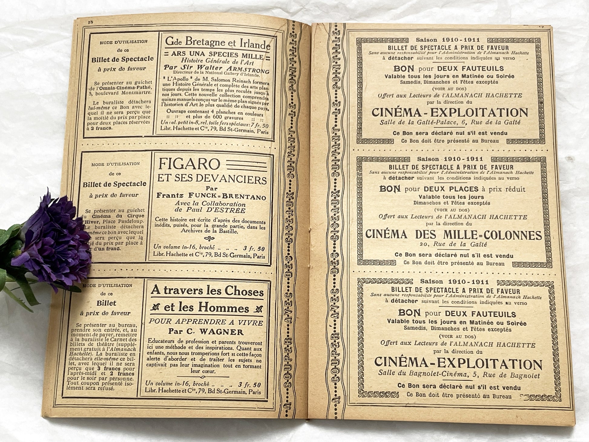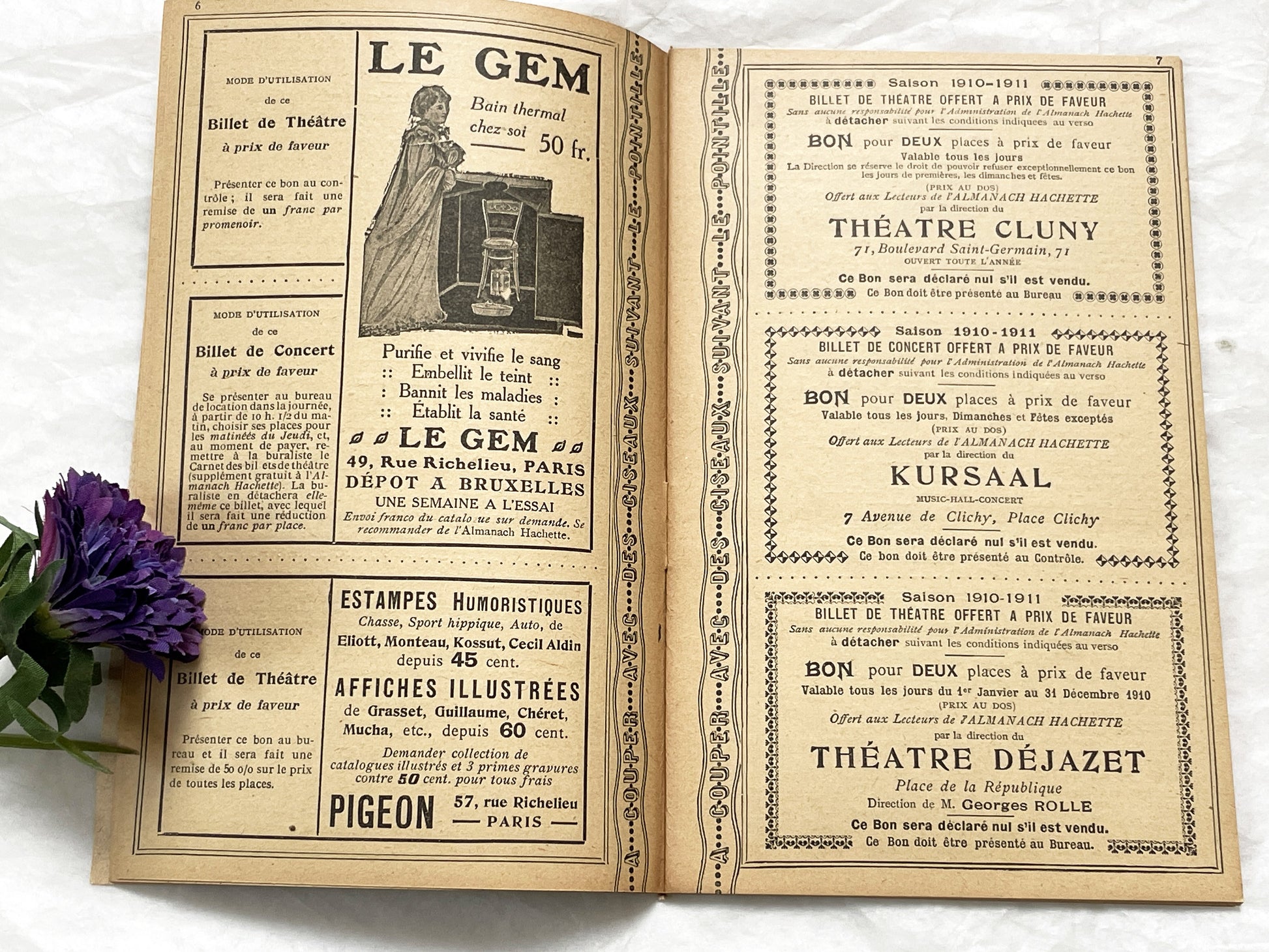 Rare original 1911 “Supplément Gratuit à l’Almanach Hachette”, a charming 42-page booklet offered as a free supplement to the famous Hachette Almanac. This delicate publication is a fascinating window into Parisian cultural life during the Belle Époque, filled with advertisements, discount coupons, and special theatre offers.