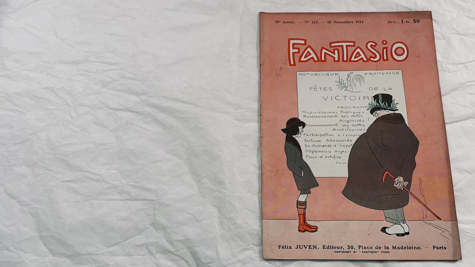 Appearing on the 1st and 15th of each month, published by the newspaper Le Rire, the bimonthly Fantasio welcomed writers such as Cami, Georges Courteline, Dominique Bonnaud, Tristan Bernard, Maurice Dekobra, Louis Delluc, etc.,and many illustrators including Albert Guillaume, Lucien Métivet, Étienne Le Rallic, Fabiano, René Giffey, Jacques Touchet, René Gontran Ranson, Georges Delaw, André Foy, Paul Colin, Maurice Sauvayre, Suzanne Meunier, Daniel de Losques, Adrien Barrère, etc.
